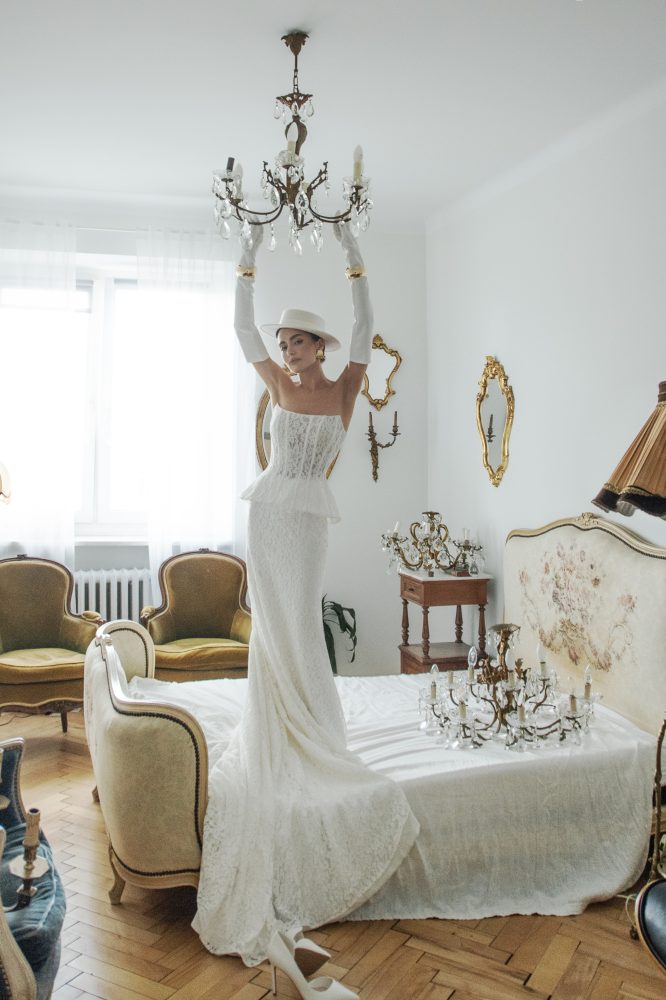 Платье, в котором каждая линия будто нарисована светом. Кружево мягко повторяет силуэт, а корсет с открытыми плечами и изящными рукавами создаёт ощущение хрупкой силы.