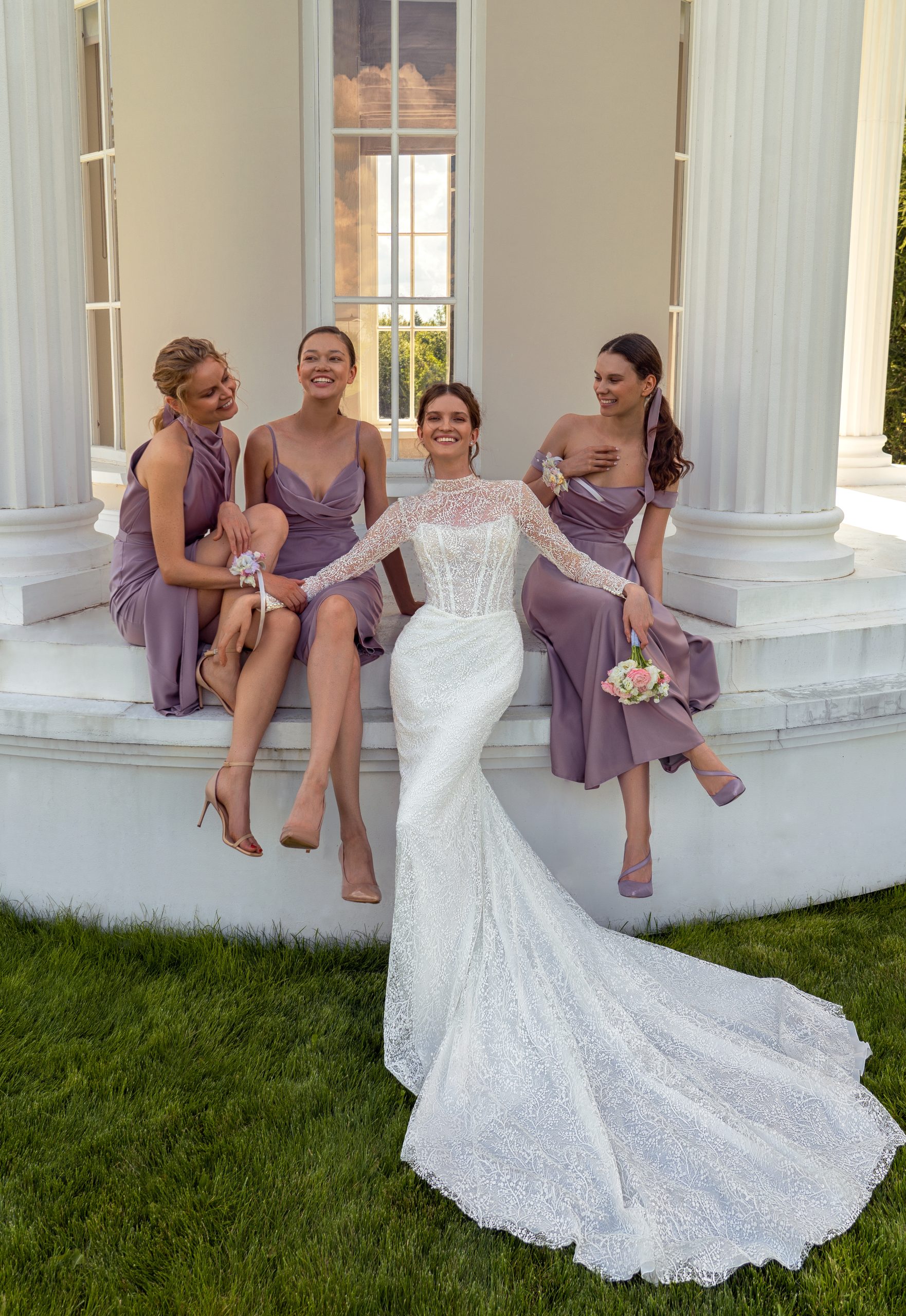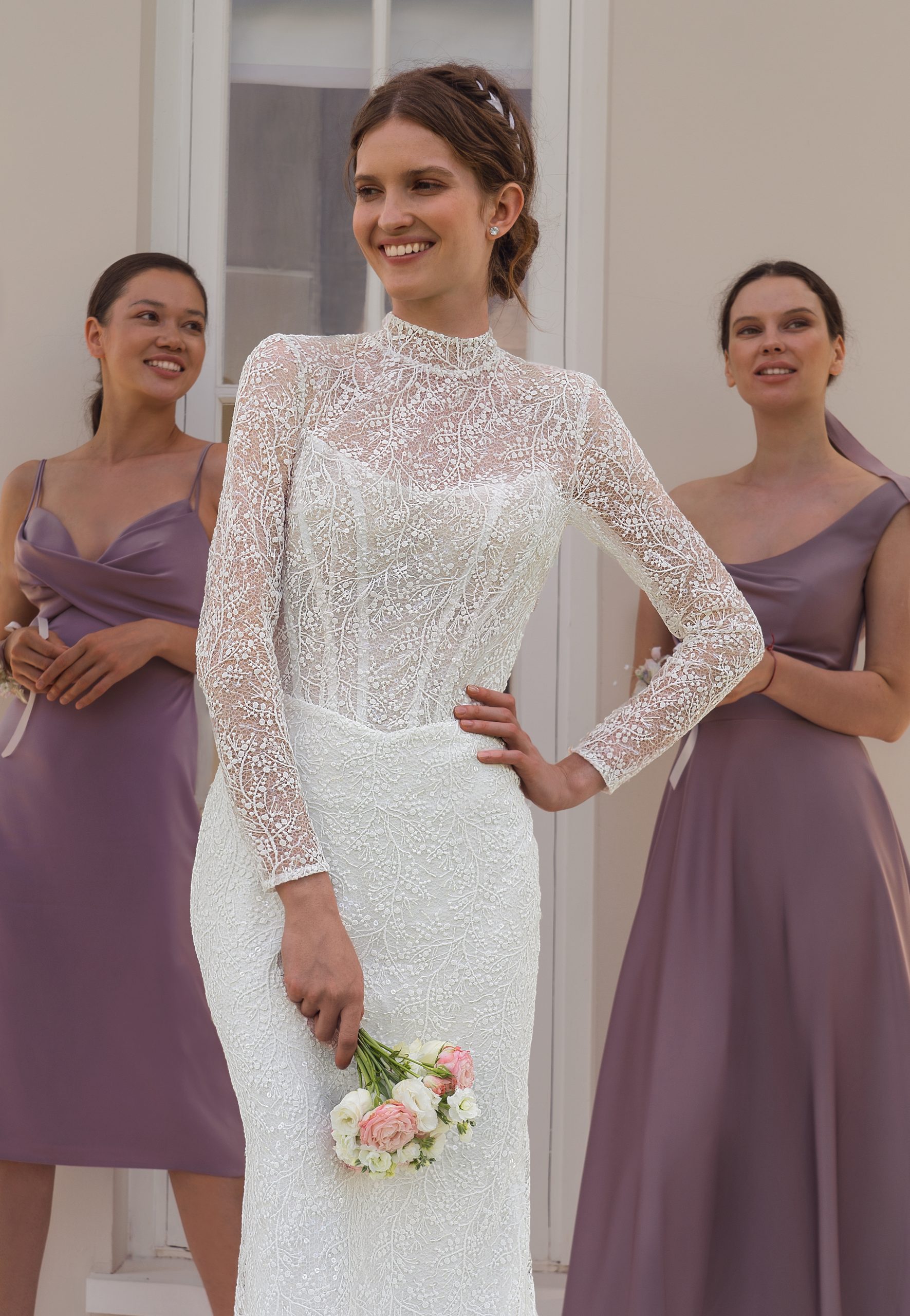 Платье, в котором хочется не спешить. Утончённое кружево с деликатным блеском, высокий ворот и изящный силуэт — всё в этом образе говорит о вкусе, спокойствии и уверенности в себе.