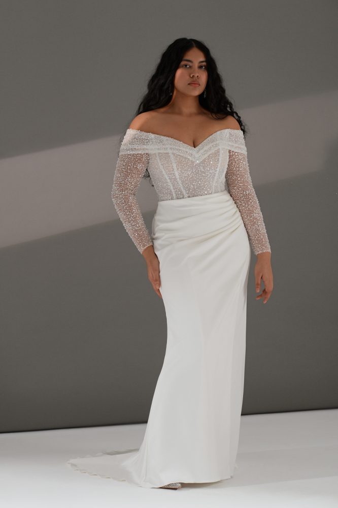 Королевская строгость с ноткой драмы. Идеально скроенный корсет, длинные рукава и драпировка на лифе создают скульптурный, чистый и очень изящный силуэт. Оно словно обнимает фигуру — и говорит за тебя.