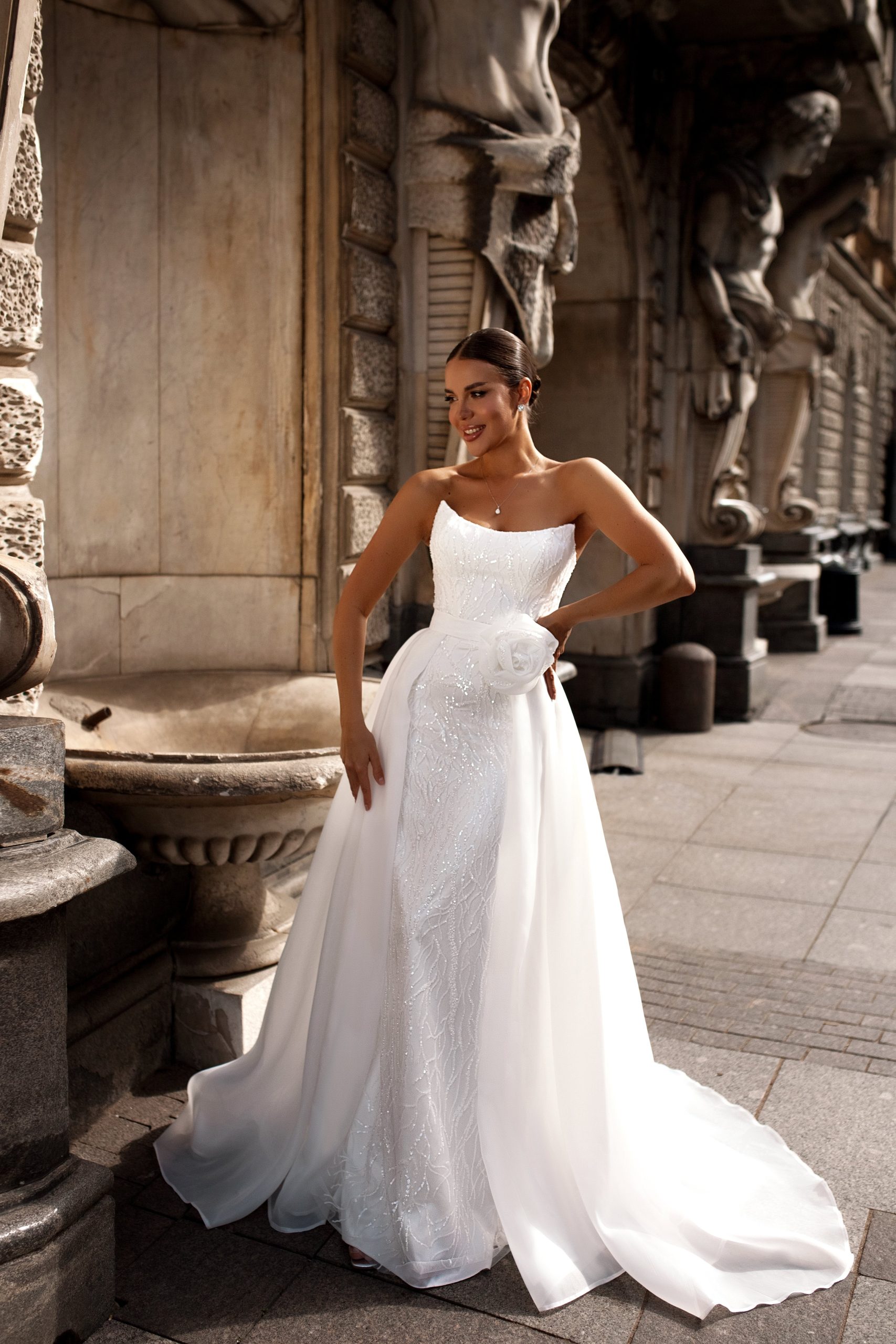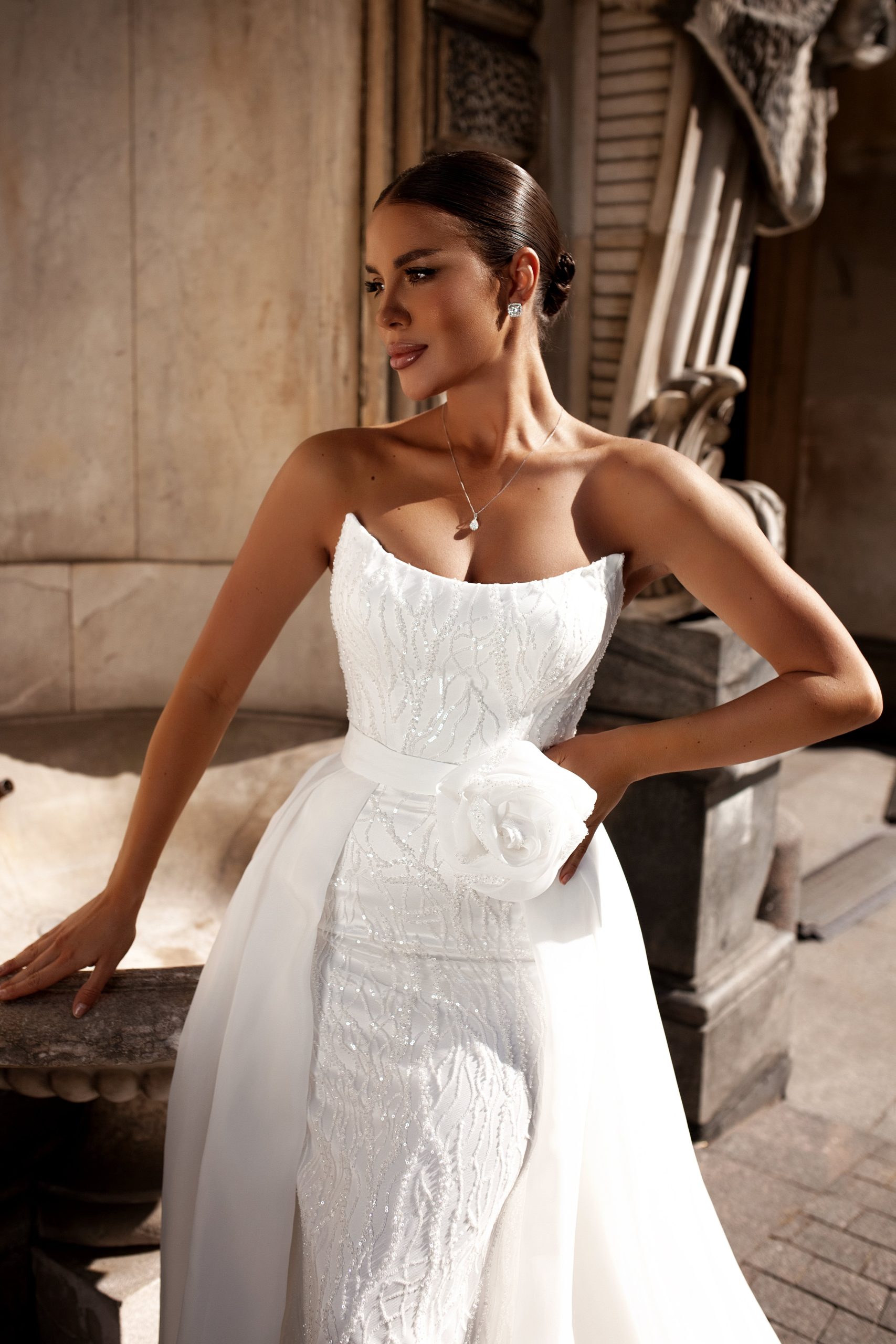 Для невест, которые хотят показать два настроения в одном образе: утончённую женственность и смелое сияние.
