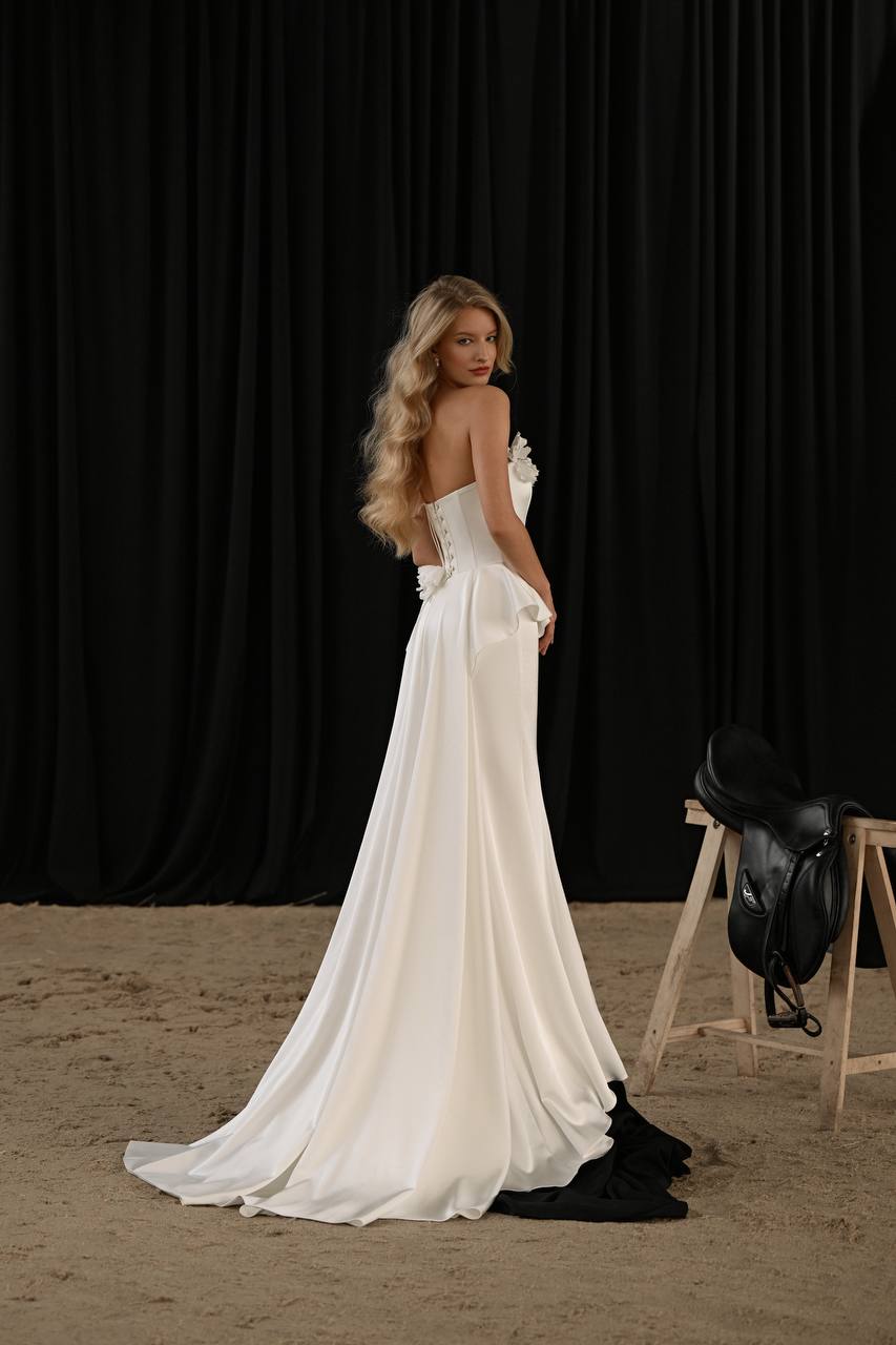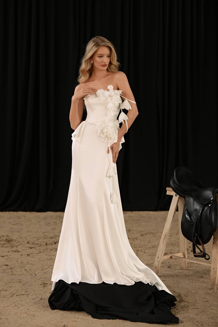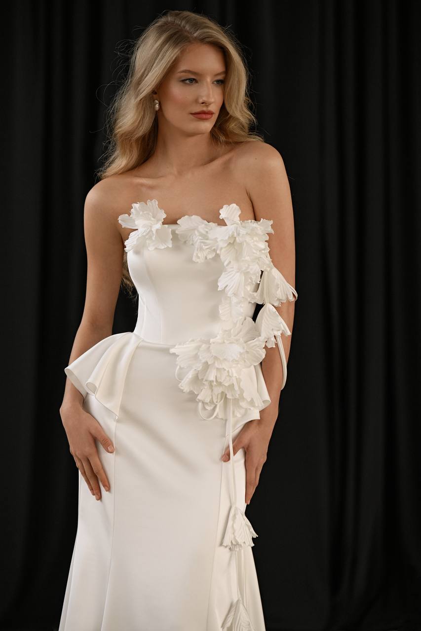 Платье, которое создано, чтобы вызывать восхищённые взгляды. Лиф без бретелей подчёркивает линию плеч, а объёмные цветы и кисточки делают образ живым, будто сошедшим с подиума. Плавный силуэт струится по фигуре, раскрывая изящность и уверенность в каждом движении.