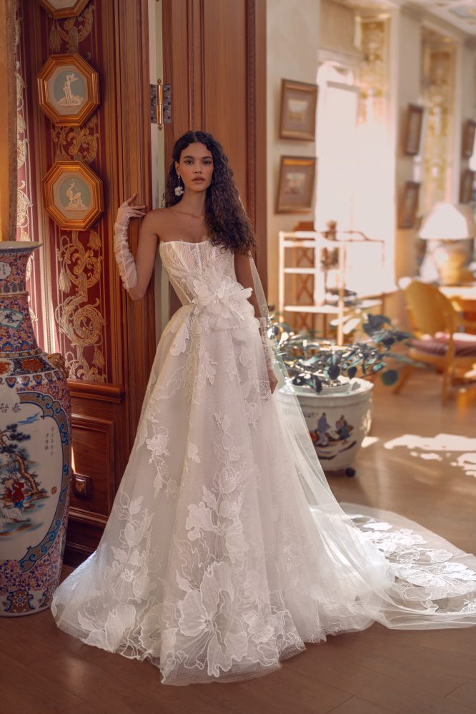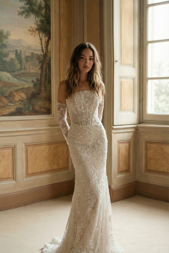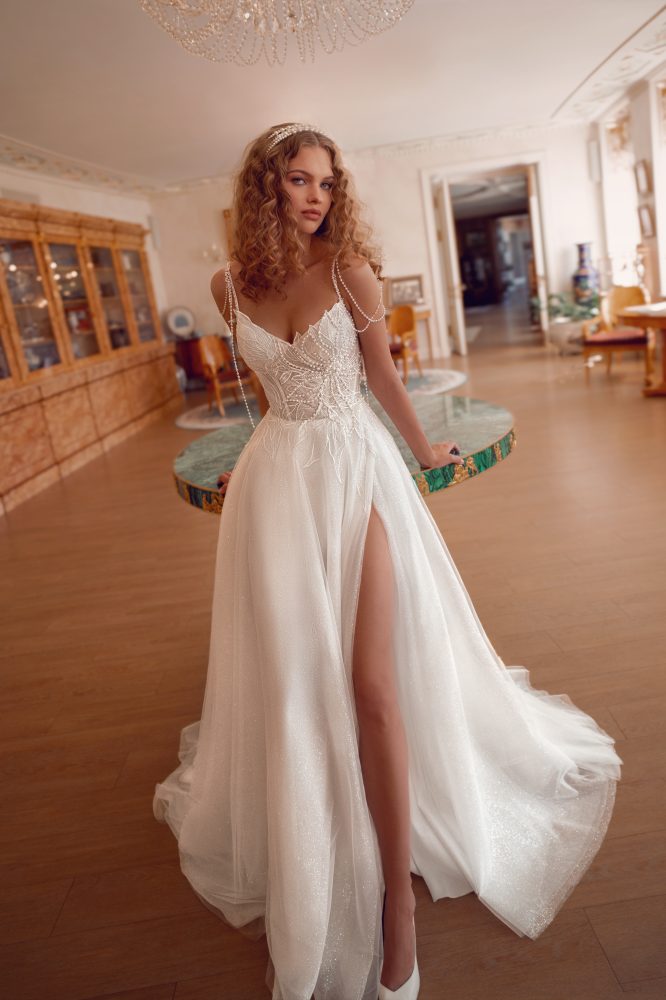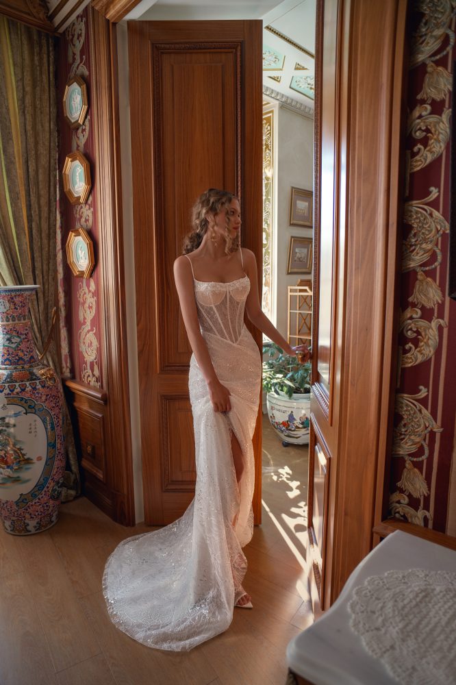 Платье, которое сочетает силу и изящество, создавая безупречный силуэт. Для невесты, которая ценит не только красоту, но и уверенность в каждом шаге. Корсет с тонкими линиями и застёжкой на спине подчёркивает фигуру, а нежные рукава, украшенные перламутровыми бусинами, создают эффект воздушности. Пышная юбка плавно раскроется при движении, даря ощущение лёгкости и величия.