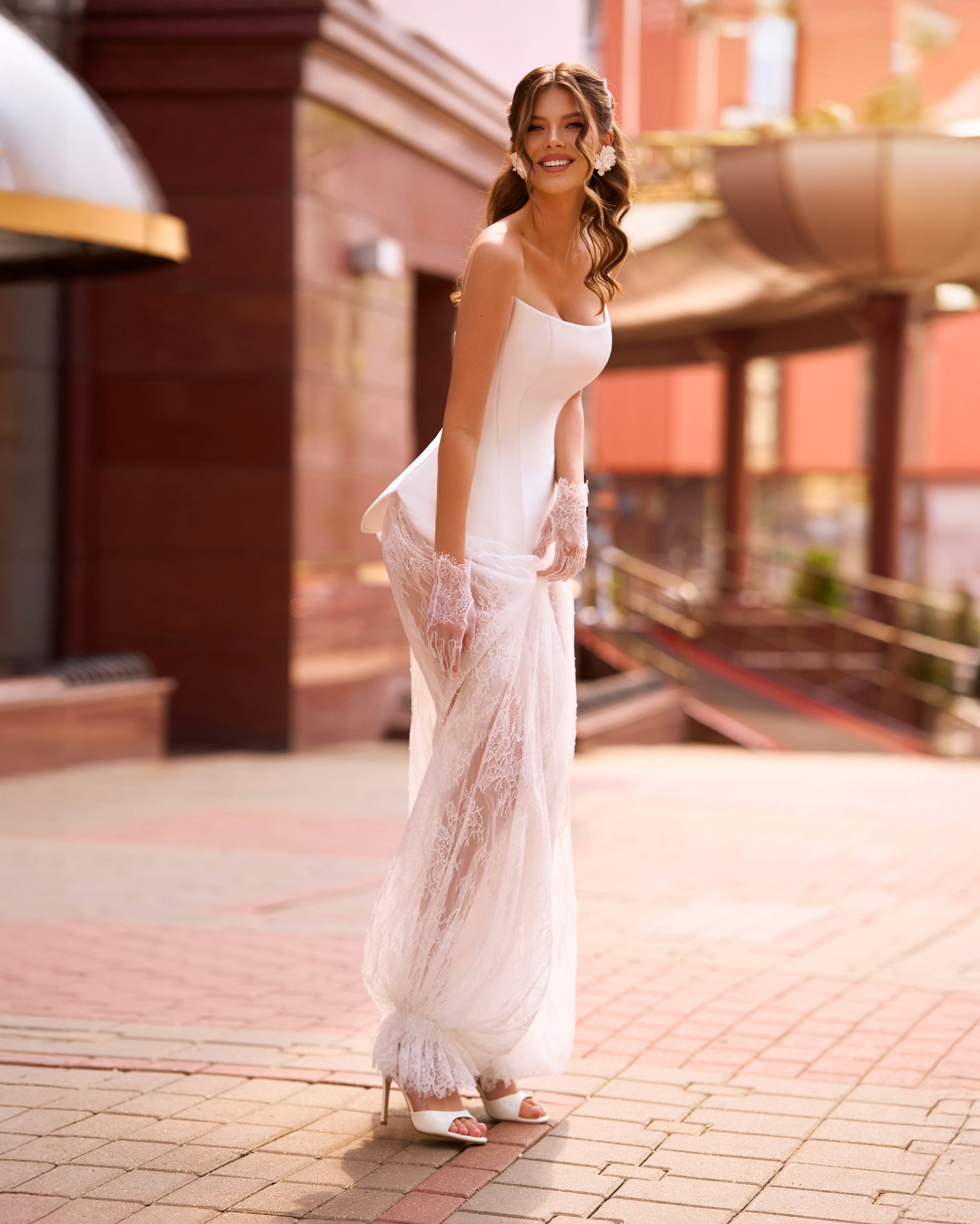Свобода и стиль в одном комплекте. Комплект Жасмин — это смелое и необычное решение для невесты, которая хочет добавить в свой свадебный день нотки свободы и яркости. Верх с тонким корсетом идеально подчеркивает фигуру, а воздушные шорты, напоминающие штаны Алладина, создают непринужденный и в то же время элегантный образ. Нежная кружевная ткань добавляет нотки романтизма и утонченности.