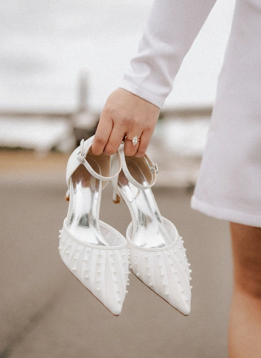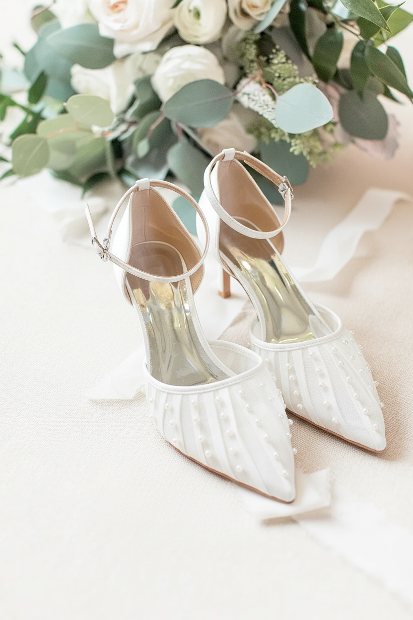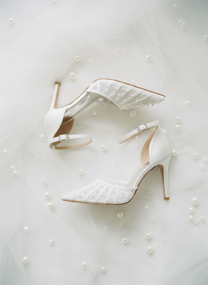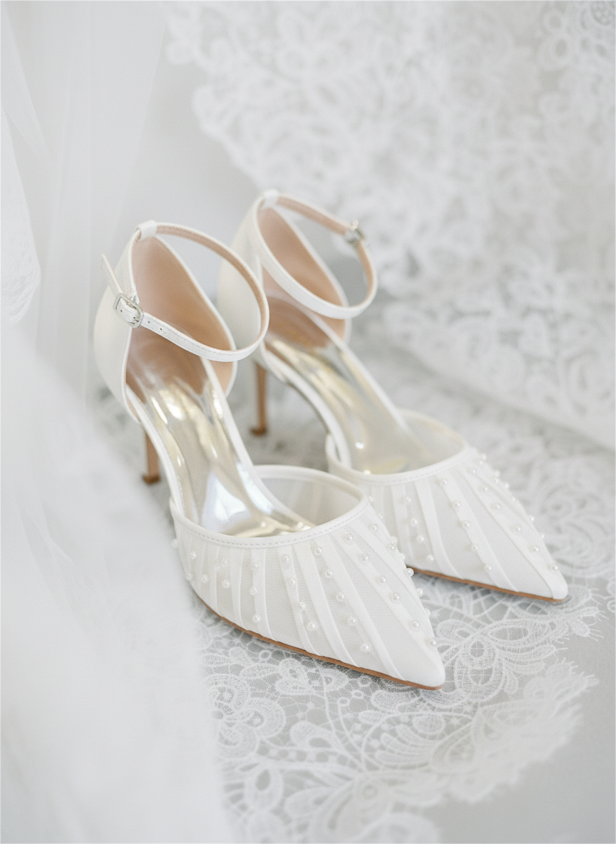 Стильные свадебные туфли на застежке с мелким жемчугом.