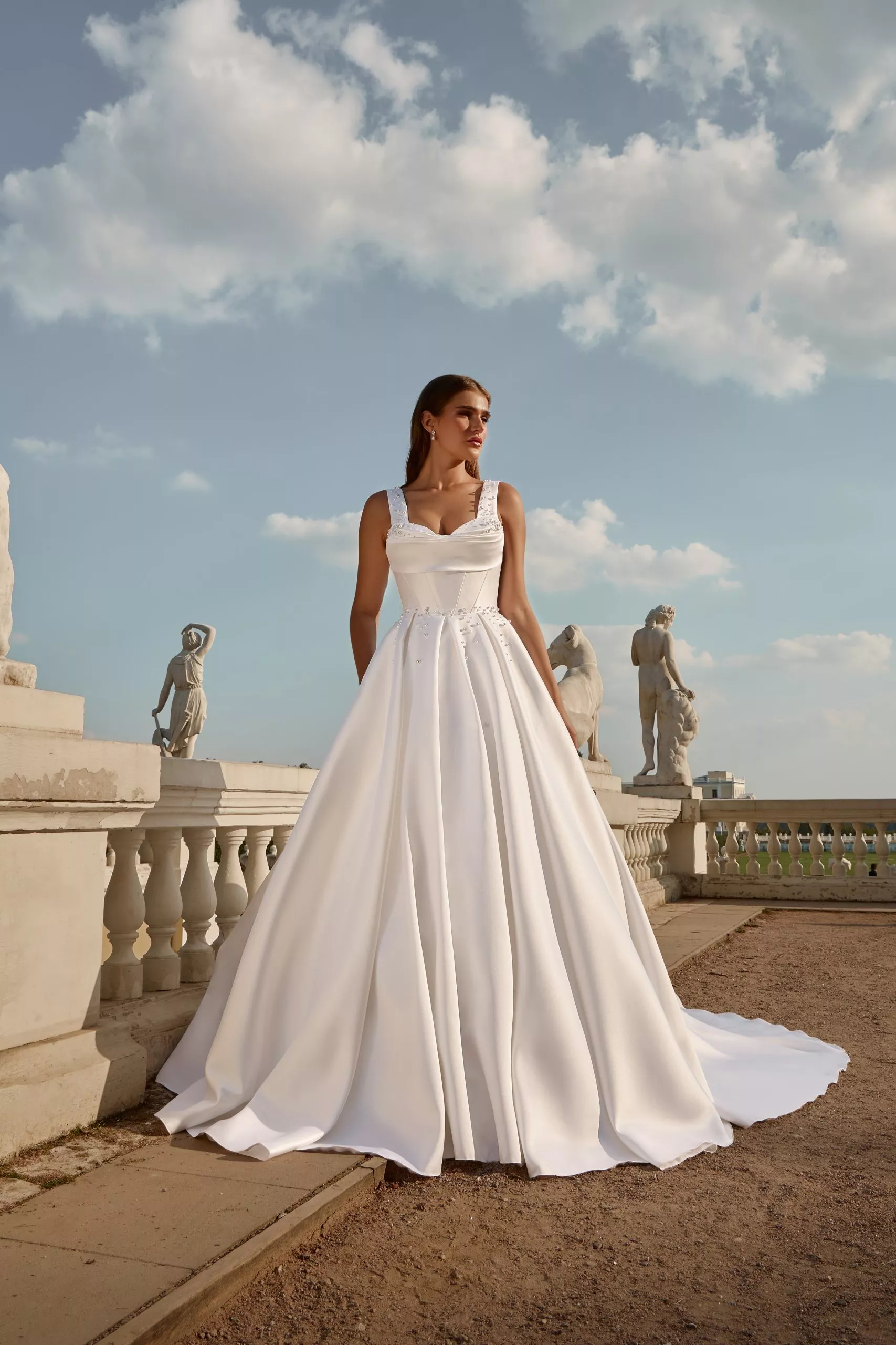 Платье с таким фасоном — идеальный выбор для невест с фигурой груша. Оно плавно расширяется от талии и скрывает бедра, создавая сбалансированный силуэт. Такой фасон не будет сковывать движения, а наоборот, подарит тебе легкость и свободу. Представь, как ты будешь сиять в этом платье!